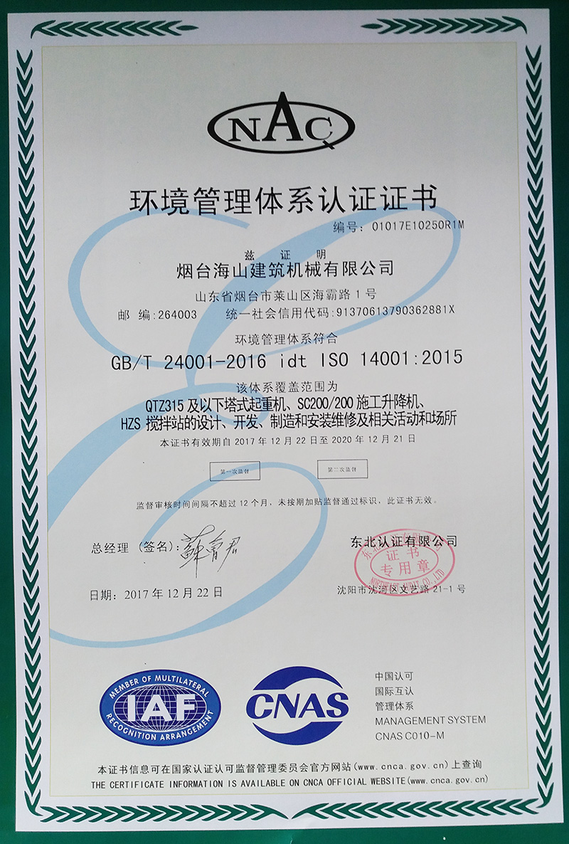 環(huán)境管理體系認(rèn)證證書